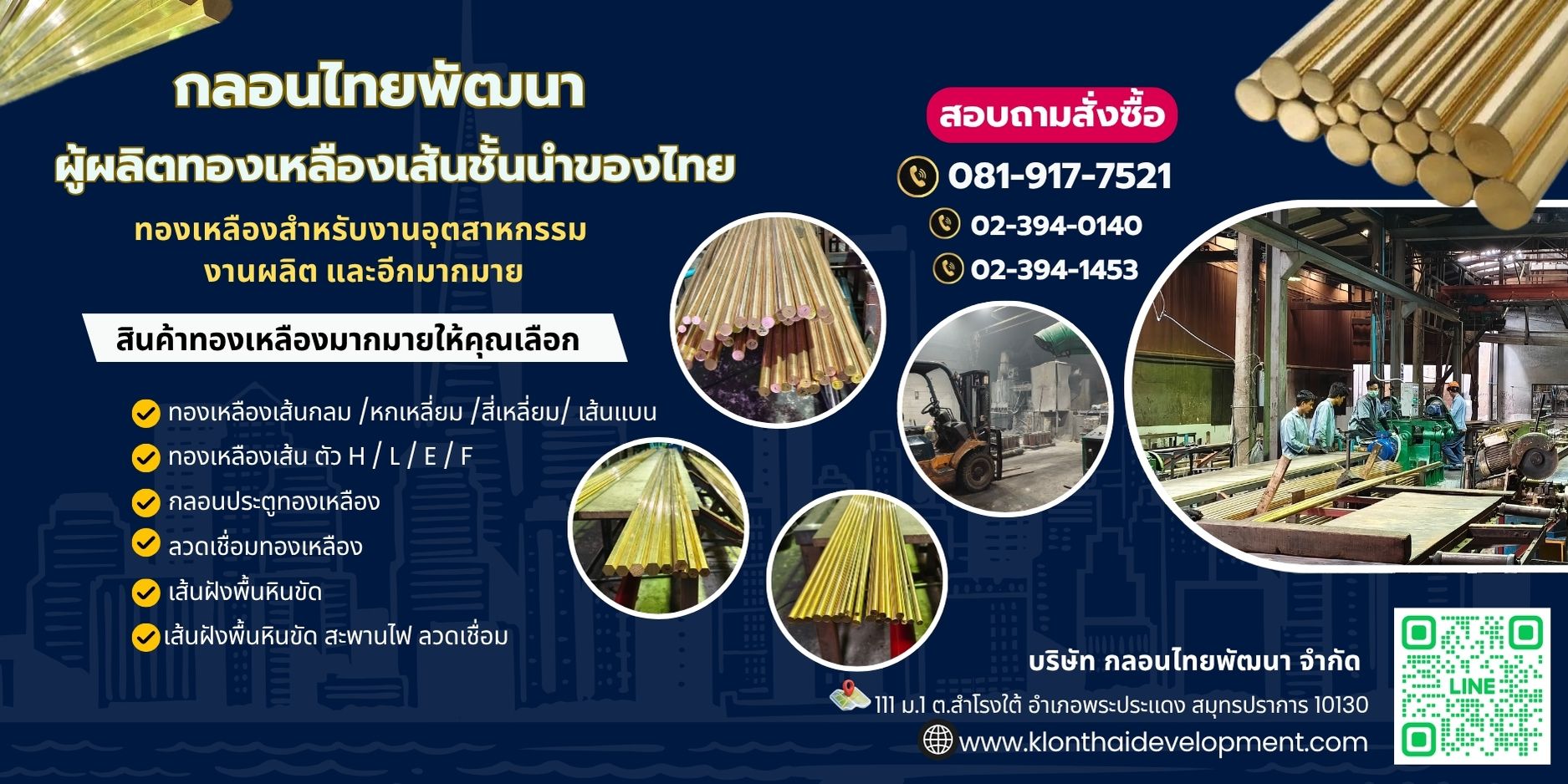เราคือโรงงานผู้ผลิตและจัดจำหน่าย ทองเหลืองเส้นและอุปกรณ์ทองเหลืองหลากหลายรูปแบบ ด้วยประสบการณ์กว่า 56 ปีในวงการโลหะและชิ้นส่วนทองเหลือง ตั้งแต่ปี 2512 จนถึงปัจจุบัน เราได้พัฒนาเทคโนโลยีการผลิต และขยายสายผลิตภัณฑ์เพื่อตอบโจทย์การใช้งานที่หลากหลายทั้งภาคอุตสาหกรรม งานช่าง และงานตกแต่ง